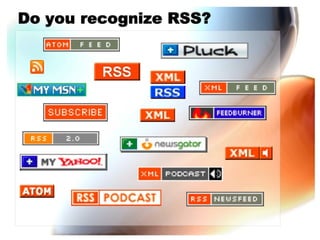 Feeders syndicate frequently updated content through web feeds, allowing users to subscribe. Aggregators collect feeds in one place for easy access. They allow users to find, subscribe to, and read new content from multiple sites and blogs in one location by copying and pasting or clicking subscribe buttons for each feed URL.