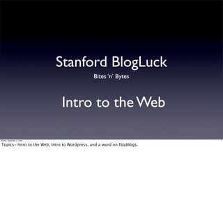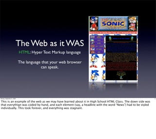 This document provides an introduction to the web and content management systems like WordPress. It discusses how the web has evolved from static HTML pages to dynamic sites powered by CSS, PHP, and SQL. WordPress is introduced as a popular content management system that combines these technologies to allow non-technical users to easily manage and update websites. Key WordPress concepts like posts, pages, themes, plugins and widgets are also overviewed.
