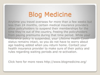 When traveling overseas for more than a few weeks but less than 24 months, some medical insurance providers permit policyholders to suspend their memberships, eliminating premium payments during this period. The suspension maintains the policyholder's lifetime health cover status, preventing age loading fees upon return. It's essential to check with your health insurance provider regarding their specific policies on suspension, waiting periods, and re-activation.