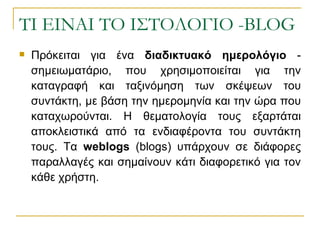 TI EINAI TO ΙΣΤΟΛΟΓΙΟ - BLOG Πρόκειται για ένα διαδικτυακό ημερολόγιο - σημειωματάριο, που χρησιμοποιείται για την καταγραφή και ταξινόμηση των σκέψεων του συντάκτη, με βάση την ημερομηνία και την ώρα που καταχωρούνται. Η θεματολογία τους εξαρτάται αποκλειστικά από τα ενδιαφέροντα του συντάκτη τους. Τα weblogs (blogs) υπάρχουν σε διάφορες παραλλαγές και σημαίνουν κάτι διαφορετικό για τον κάθε χρήστη.