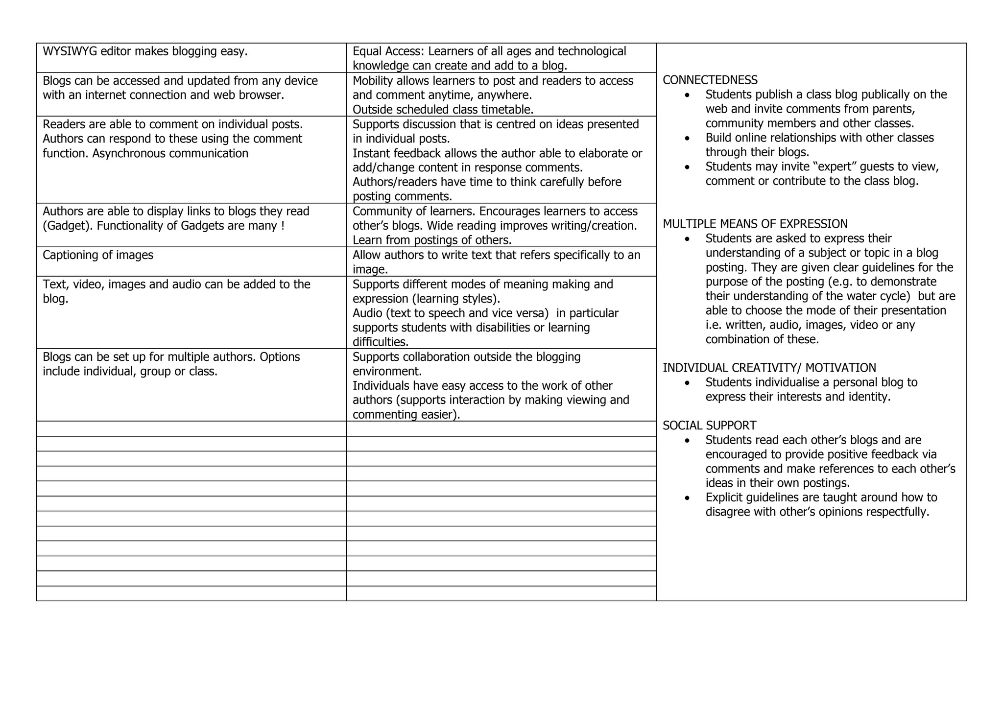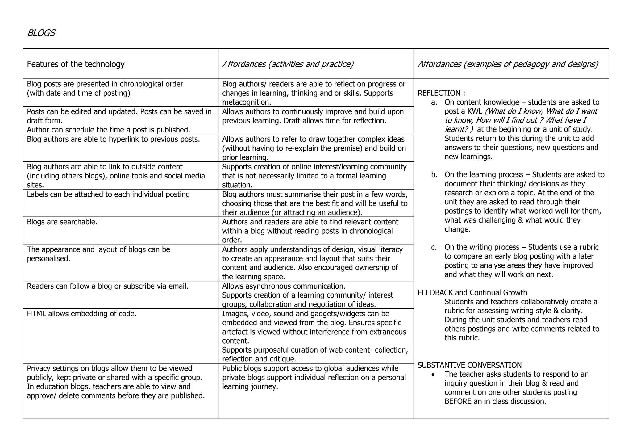 Blogs allow for reflection on learning, feedback and growth through comments, and building upon ideas over time. Key features include chronological posts, ability to edit and schedule posts, hyperlink to other sources, and comment on individual posts. This supports reflection on content and process, developing understanding through substantive conversation, and building an online learning community through sharing blogs publicly or within groups.