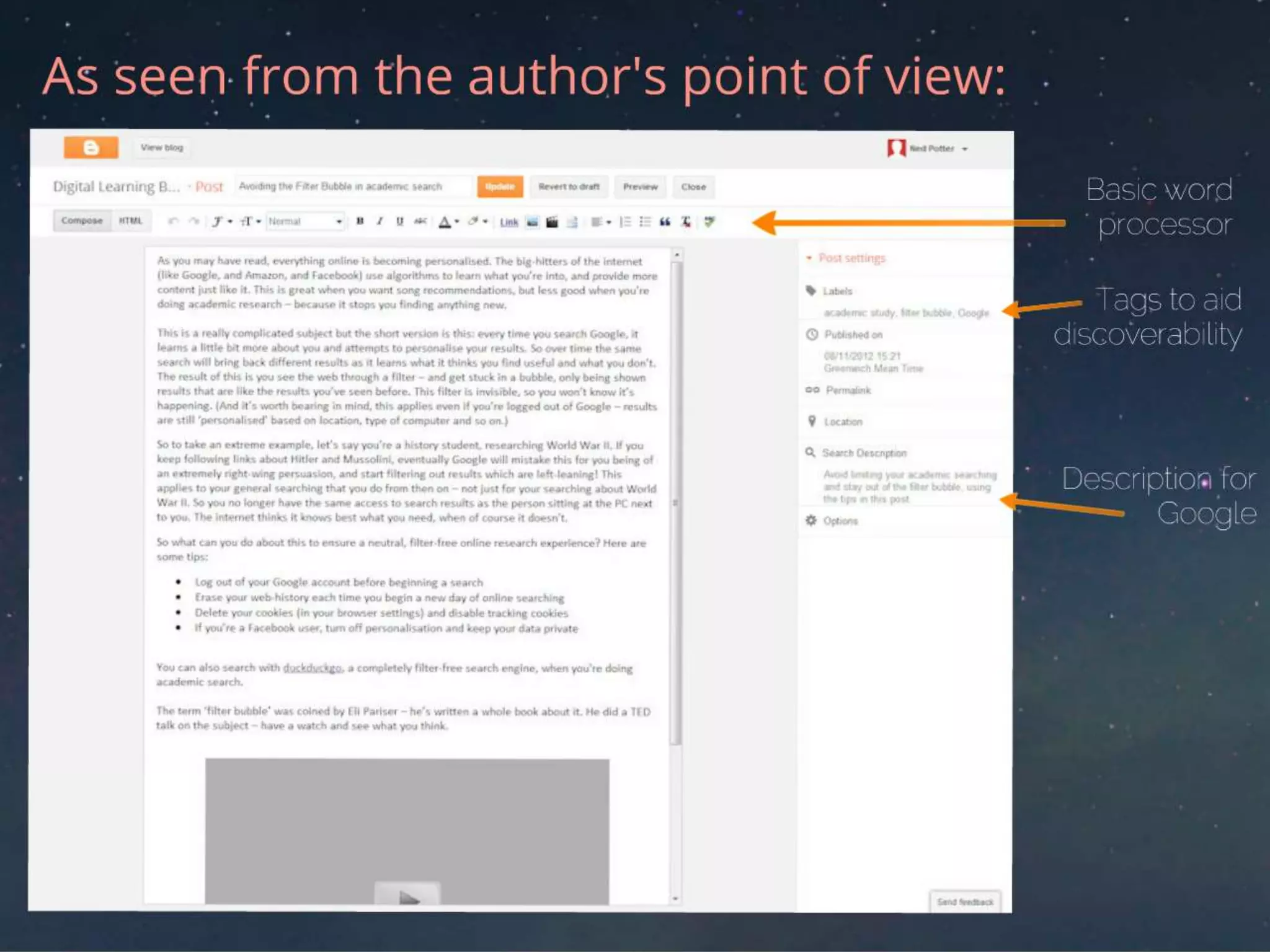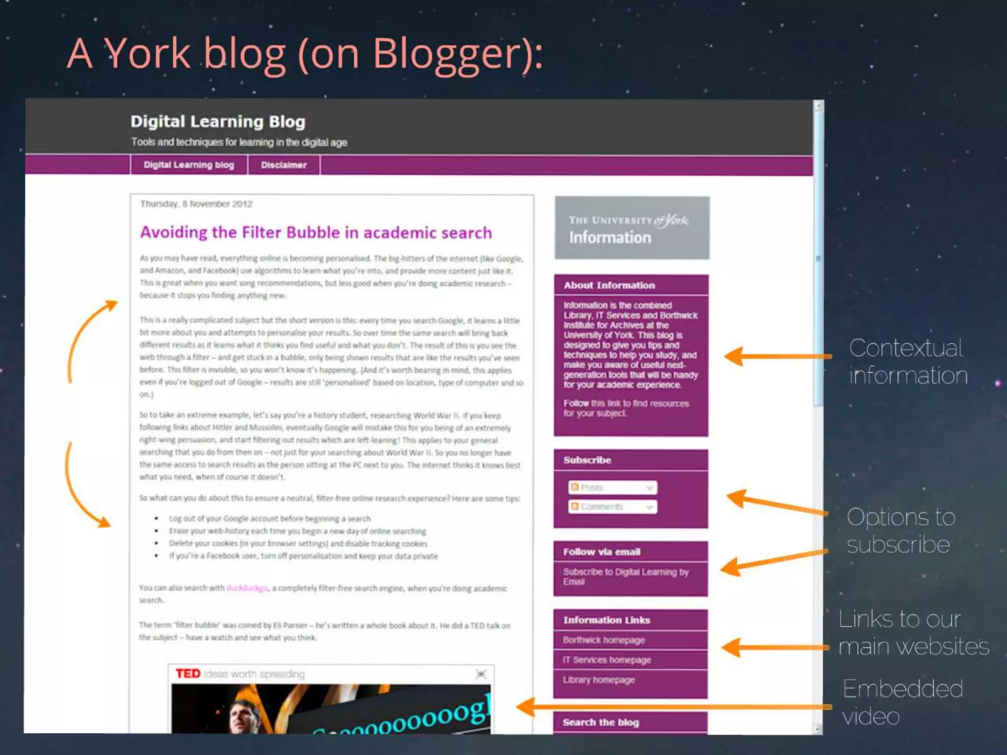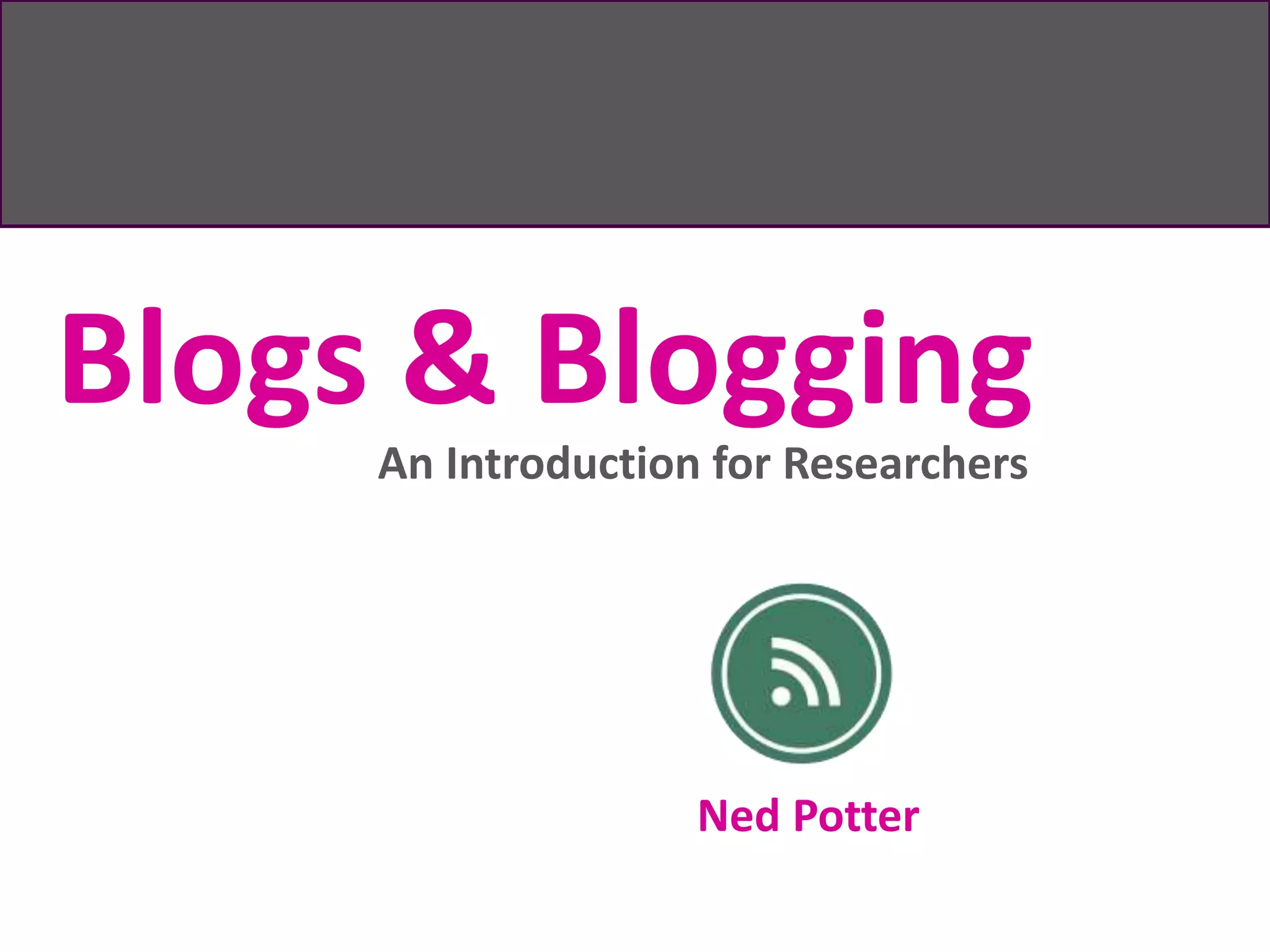 This document provides an introduction to blogging for researchers. It defines what blogs are, explaining that they are regularly updated webpages consisting of posts on various themes. Blogs are considered a form of social media as they allow for interaction through comments and sharing. The document discusses why blogging is relevant for researchers, noting that it can increase the audience and impact of their work. Potential uses of blogging discussed include communicating ideas to a wider group, facilitating collaboration, and using blogs in teaching, such as having students summarize class content. Guidelines are provided on how to blog effectively, such as writing for the web in an accessible style and encouraging interaction through comments and links.
