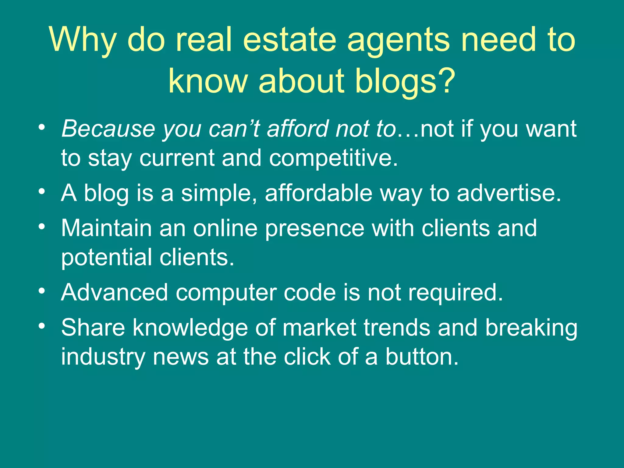 The document provides information about blogging and social networking for real estate agents. It defines what a blog is, explains why agents should blog, and gives many ideas for blog post topics. It also defines social networking and lists several popular sites like Facebook, LinkedIn, and Twitter that agents can use to connect with clients and prospects. It encourages agents to take advantage of these free marketing tools.