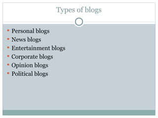 Blogs are web logs that allow people to share information on any topic. Bloggers participate in influencing public opinion as speakers and writers in the public square. Great bloggers speak with informed, personal authority through an honest, lively voice and engage readers in productive conversations through comments. To write a great blog, one should write about their passions and admit when they don't know something, seeing their posts as the start of a discussion rather than the final word. Linking to other blogs and commenting on them helps bloggers become more visible and bring in more readers.