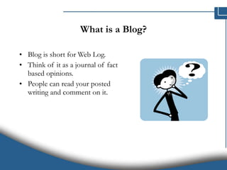 This document provides instructions for starting and maintaining a blog. It defines what a blog is, discusses dos and don'ts for blogging, and outlines steps for using classroom blogs, writing blog posts, finding topics, customizing a blog, and more. The key steps are to choose a blogging platform like Blogger or WordPress, create an account, select a template, write and publish posts, and personalize the blog with features like comments, tabs, and statistics.