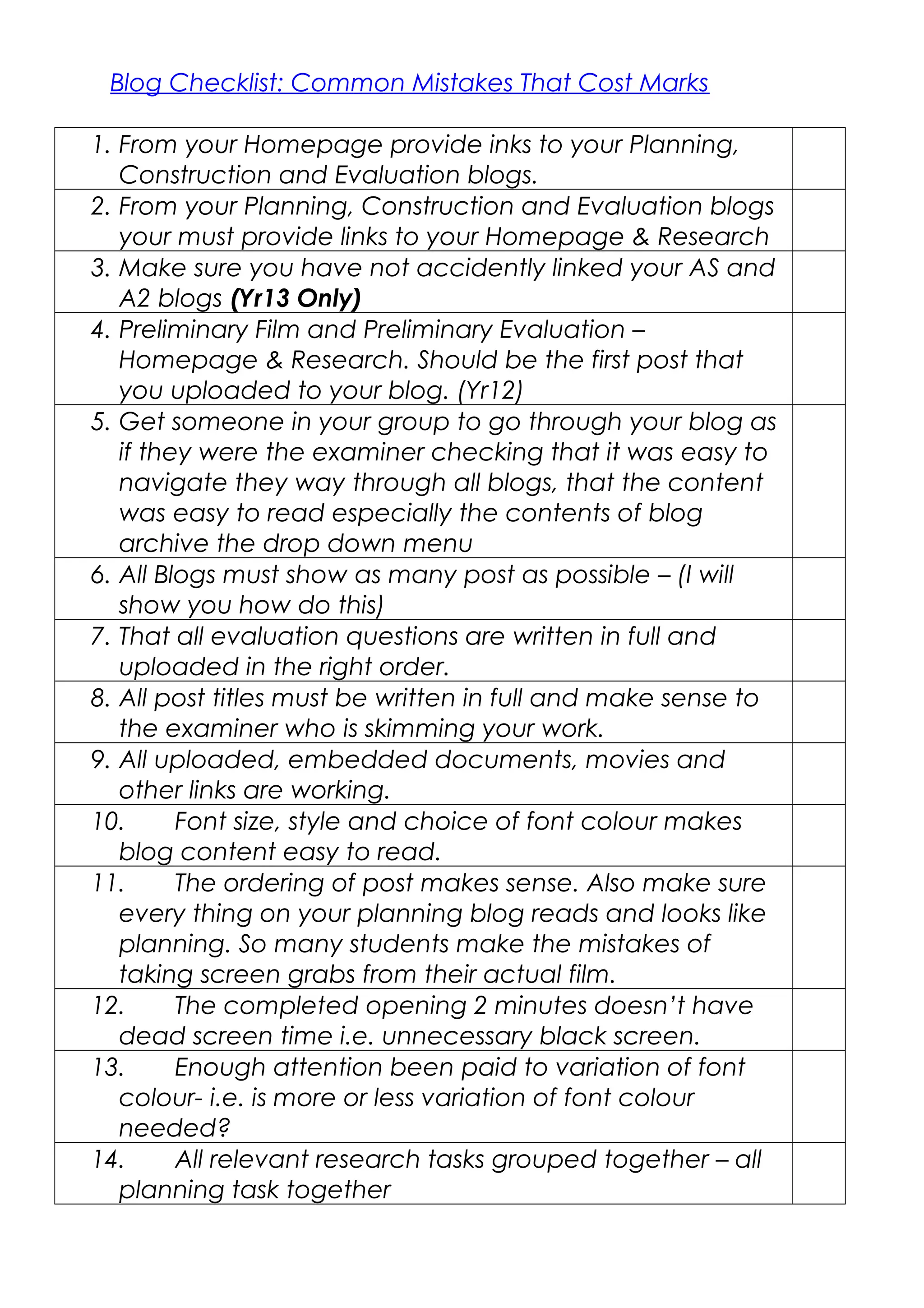 1. The document provides a checklist of 20 common mistakes students make in blogs that can cost them marks. It addresses issues like missing or broken links between blogs, disorganized content, illegible formatting, and lack of key planning documents.