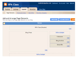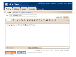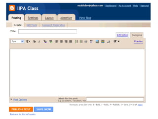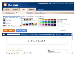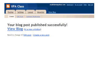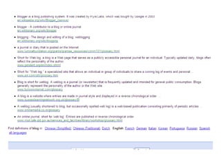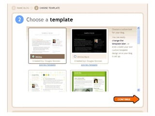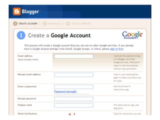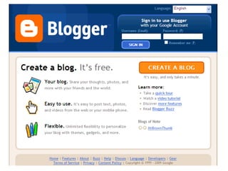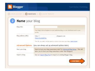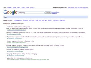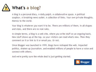 Blogs are websites where users write ongoing content that is displayed from newest to oldest. Readers can comment on, link to, or share blog posts via email. Blogs are used for various purposes like sharing interests, thoughts, photos, or for celebrities, politics, advocacy, corporate communications. The document walks through setting up a blog using Blogger, customizing it, and notes blogs are typically RSS enabled.