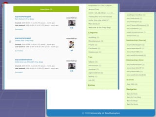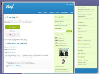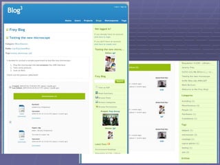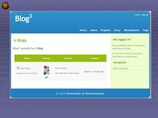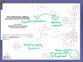 The document discusses electronic laboratory notebooks and blogs as a way to record scientific experiments and share data. It proposes using blogs to document experiments in a more collaborative way, while also capturing metadata and linking data to provide context. Challenges addressed include capturing the full context around experiments, facilitating collaboration and discussion, and improving access to data over time.