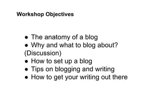This document provides information and guidance about blogging. It discusses the anatomy of a blog, including common elements like banners, about sections, posts, and social media buttons. It encourages blogging about creative works, staff updates, professional ideas, new resources, and interesting finds. The document offers tips for setting up a blog, including choosing a title, enabling collaborators, scheduling posts, and deciding on the level of detail. It also provides suggestions for images, analytics, writing engaging posts, and promoting the blog through social media. The overall message is that blogging can be a way to communicate research and other work to wider audiences.