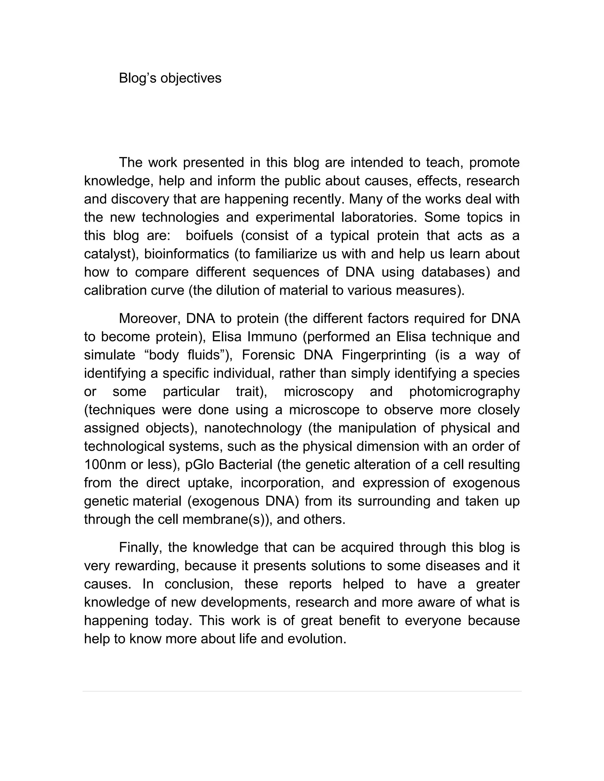 This blog aims to educate the public about recent causes, effects, research, and discoveries related to new technologies and experimental laboratories. Some topics covered include biofuels, bioinformatics, calibration curves, DNA to protein translation, ELISA immunoassays, forensic DNA fingerprinting, microscopy techniques, nanotechnology, bacterial genetic alteration, and more. The knowledge shared through this blog is rewarding as it presents solutions to diseases and their causes. In conclusion, these reports help increase understanding of current research developments and raise awareness of modern advances.