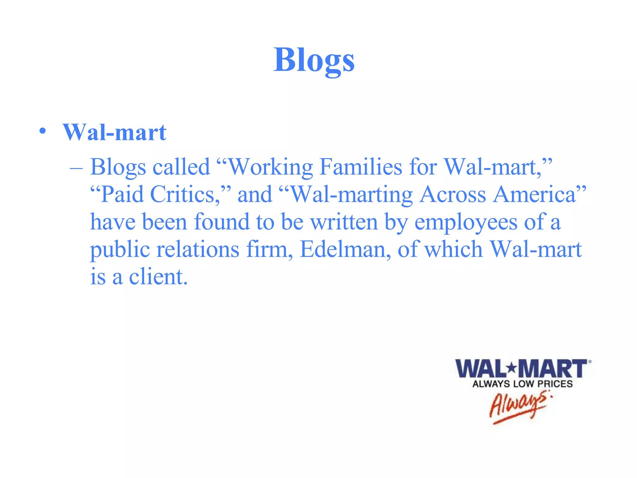1) Several blogs promoting Wal-Mart, a PR client of Edelman, were found to be authored by Edelman employees, not actual customers as presented.