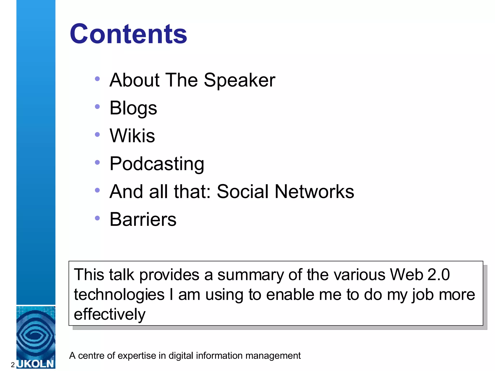 The document discusses Brian Kelly's experiences and best practices in utilizing Web 2.0 technologies such as blogs, wikis, and social networks for effective communication and engagement within the higher education and cultural heritage sectors. He highlights the success of his UK Web Focus blog, the use of wikis during events, and the benefits of multimedia tools like SlideShare and podcasts to reach broader audiences. Additionally, it addresses barriers to adopting these technologies and emphasizes the importance of user engagement and feedback.