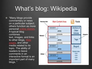 This document discusses different types of blogs and their uses in education. It describes personal blogs, microblogs, corporate/organizational blogs, genre blogs focused on topics like politics, and blogs defined by their media type like photoblogs. Moblogs written on mobile devices are also mentioned. The document then discusses how blogs can be used as learning logs for students to reflect on and externalize their thinking, allowing other learners to comment. It encourages readers to start their own WordPress blog and provides references on blogging and education.