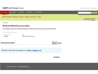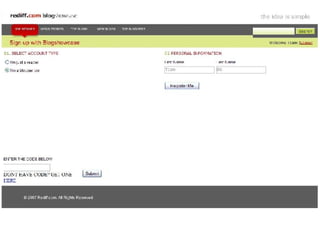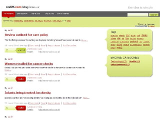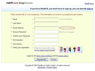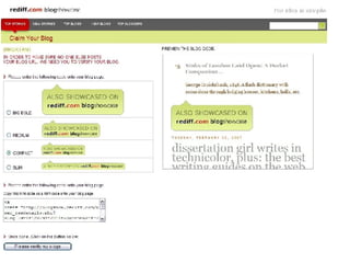 The document discusses findings about bloggers, including that they don't follow conventional rules and see blogging as their primary means of communication. It then presents a new service called Blog Showcase that would allow bloggers to have their blogs showcased on Rediff to gain recognition, traffic, and share content with readers while continuing to blog on their preferred platform. The presentation asks bloggers to blog about and spread the word about Blog Showcase if they like the idea.