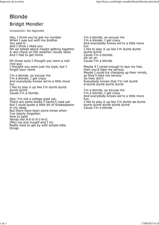 The song is about a blonde woman who is stereotyped as dumb because of her hair color. She acknowledges some common blonde stereotypes like forgetting names and misspelling words. However, she asserts that she is not actually dumb and likes to play up the dumb blonde persona for fun, though others take the stereotype more seriously. She wishes people would see her for who she really is rather than making assumptions based on her hair color alone.