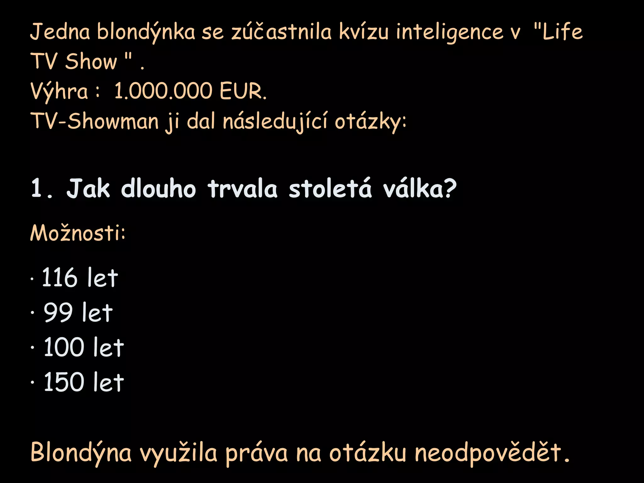 Jedna blondýnka sezúčastnila kvízu inteligence v "Life TV Show " . Výhra : 1.000.000 EUR. TV-Showman ji dal následující otázky : 1. Jak dlouho trvala stoletá válka ? Možnosti : · 116 let · 99 let · 100 let · 150 let Blondýna využila práva na otázku neodpovědět .