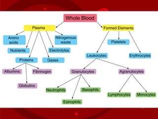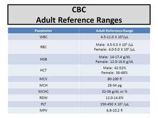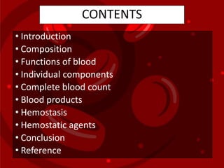This document provides an overview of blood and its components. It discusses the composition and functions of blood, the cellular components including red blood cells, white blood cells and platelets. It describes complete blood count tests and normal ranges. Conditions that cause increases or decreases in various blood cell counts are outlined. The document emphasizes the importance of understanding blood and hemostasis as an oral surgeon dealing with medically compromised patients.