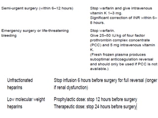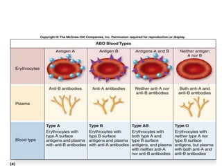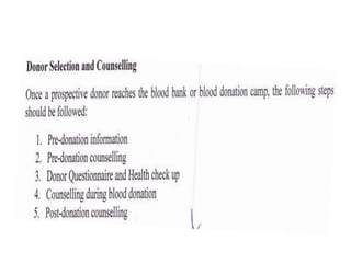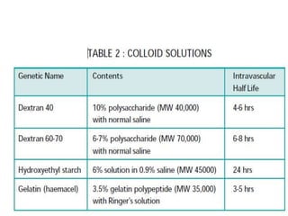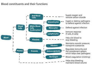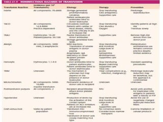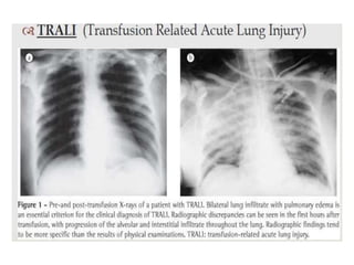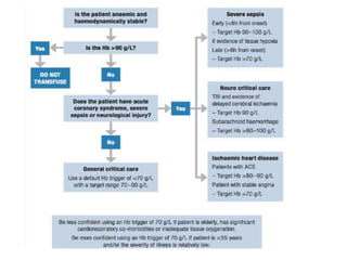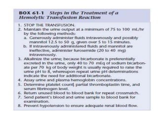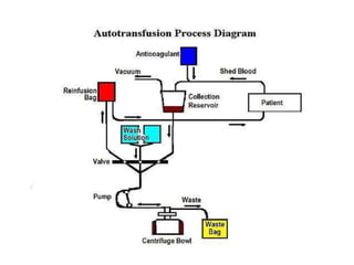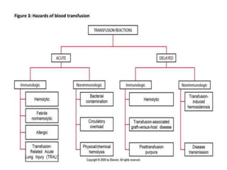 Transfusion of blood and blood products can be used to treat various conditions related to deficiencies in red blood cells, platelets, or clotting factors. There are several types of blood products including packed red blood cells, fresh whole blood, platelet concentrates, fresh frozen plasma, and cryoprecipitate. Massive transfusions involving 10 or more units of blood in 24 hours require special consideration and guidelines recommend maintaining a 1:1:1 ratio of plasma, platelets, and packed red blood cells. Acute normovolemic hemodilution involves removing blood pre-operatively and replacing volume with crystalloids or colloids to reduce transfusion needs during anticipated significant blood loss.