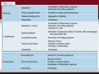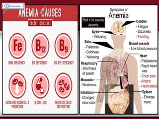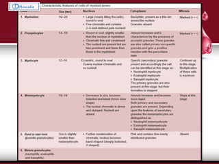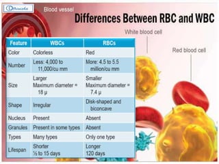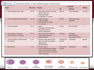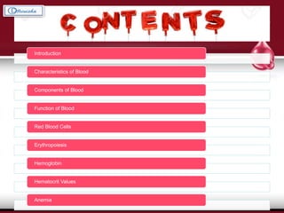 This document provides an overview of blood and its components. It discusses the characteristics of blood, including its color, volume, viscosity, and pH. It describes the two main components of blood: plasma and cellular elements. It then covers the functions of blood in nutrition, respiration, excretion, transport, protection, and homeostasis. Specific components of blood like red blood cells, hemoglobin, hematocrit values, and anemia are explained in detail. The process of erythropoiesis and factors regulating it are also summarized.