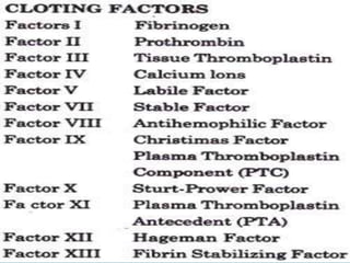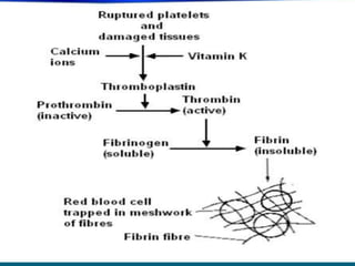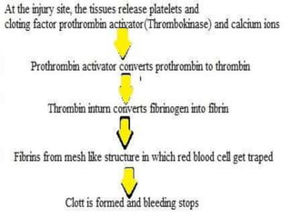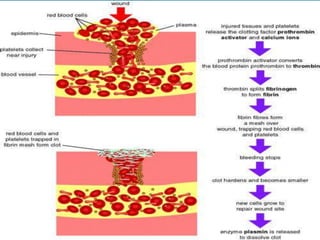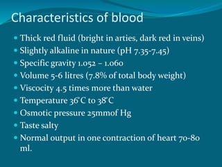 Blood is a thick red fluid composed of plasma and blood cells. It circulates through the body carrying oxygen, nutrients, hormones, and waste. Blood's key functions include transport, protection, regulation, and maintenance of pH balance. It is composed of red blood cells, white blood cells, platelets suspended in plasma containing proteins, salts, and other substances. Coagulation is the process by which blood forms clots to prevent blood loss after an injury.