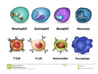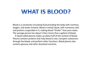 Blood has three main functions: transport, protection, and regulation. It transports gases, nutrients, hormones, heat, and waste throughout the body. Blood also protects the body through white blood cells that destroy pathogens and platelets that initiate clotting. Additionally, blood helps regulate pH, water balance, and other processes. Blood is composed of plasma, red blood cells, white blood cells, and platelets, each with distinct roles in these important functions.