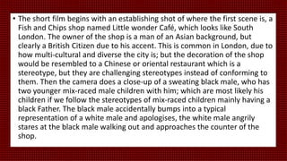 3) It is revealed the boys are actually the sons of another white man in the shop, shocking the rude customer. The film highlights ongoing racism in London's diverse communities and advocates responding to racism with morality rather than violence.