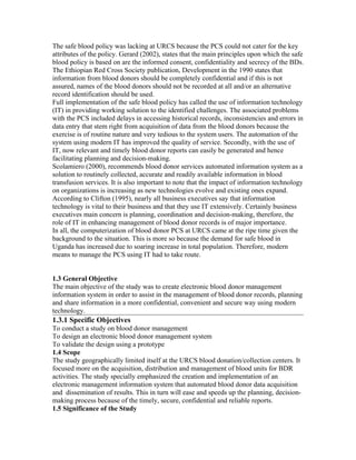 The document discusses the development of a blood management information system to assist in managing blood donor records and distributing blood supplies based on hospital demands. It aims to provide quick access to donor records, enable monitoring of donation activities, and generate timely reports to facilitate planning and decision making. The system was designed to address challenges with the previous paper-based system, such as delays in accessing records, data errors, and lack of security and confidentiality of medical information. It analyzes requirements for the new electronic system and compares other blood donor management systems to identify successes and limitations.
