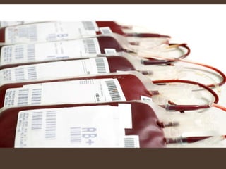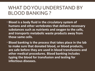The document explains blood banking, defined as the process of ensuring the safety of donated blood for transfusions. It outlines donor criteria, types of donations, and the testing procedures to screen for infections. Additionally, it details the components of blood and their uses, storage durations for blood products, and necessary equipment for blood collection.