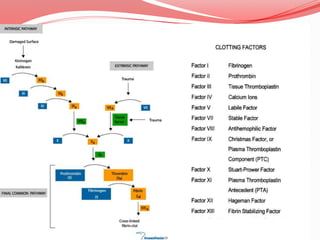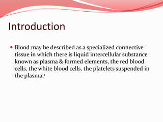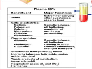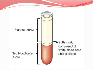 This document provides information about the composition and functions of blood. It discusses the different components of blood including plasma, red blood cells, white blood cells and platelets. It describes the functions of blood such as transport, defense, regulation and more. It also covers topics like blood viscosity, coagulation, and the lifespan and development of red blood cells.