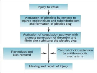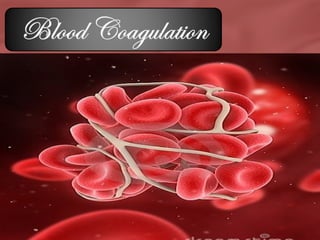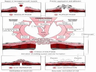Hemostasis is the process of forming clots in damaged blood vessels to prevent blood loss while maintaining a fluid state in the vascular system. It involves several stages: vascular constriction, platelet plug formation, coagulation, clot retraction, and fibrinolysis. The process ultimately leads to the dissolution of the clot through fibroblast invasion and tissue organization.