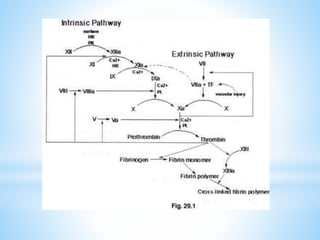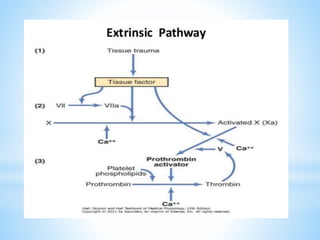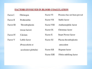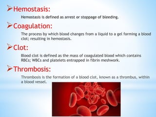 This document summarizes the process of hemostasis and coagulation. It begins with definitions of key terms like hemostasis, coagulation, and thrombosis. It then describes the three stages of hemostasis - vasoconstriction, platelet plug formation, and blood clot formation. The roles of platelets, thromboxane A2, and fibrin in coagulation are explained. Finally, it provides an overview of the intrinsic and extrinsic coagulation pathways and the role of calcium and vitamin K in blood clotting.