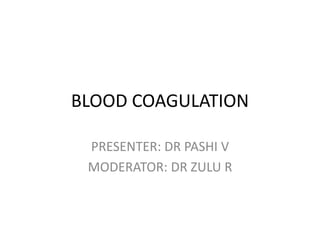 This document summarizes blood coagulation and hemostasis. It discusses platelets, the platelet plug formation process, and the intrinsic and extrinsic pathways of blood coagulation. Disorders of coagulation covered include hemophilia A/B/C, von Willebrand disease, and purpura. Tests of hemostatic function like bleeding time, clotting time, and prothrombin time are also outlined. Anticoagulants like heparin and warfarin are briefly described.