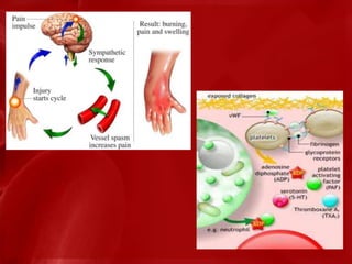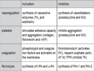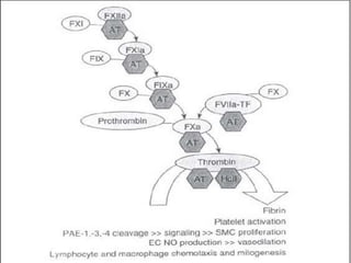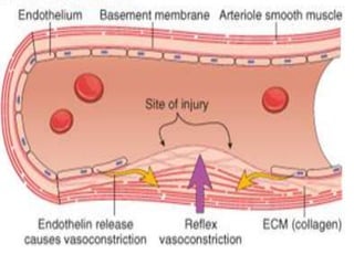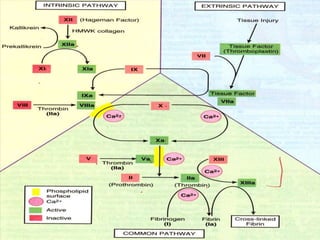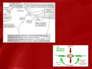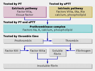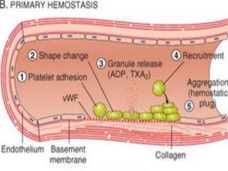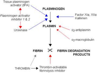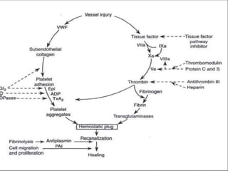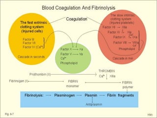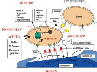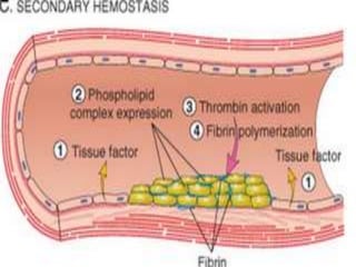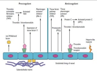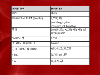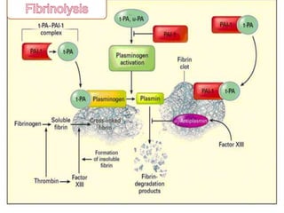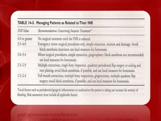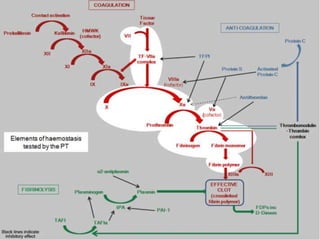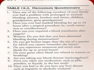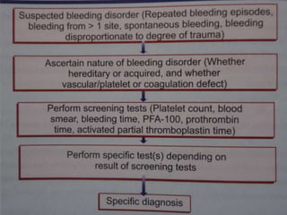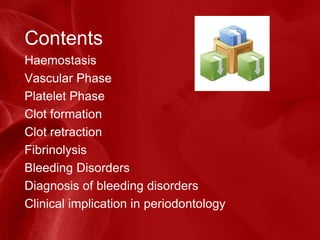 The document summarizes key aspects of haemostasis including the vascular, platelet and clotting phases. It describes tests used to diagnose bleeding disorders affecting primary (platelets) and secondary (clotting factors) hemostasis. Clinical features of platelet and coagulation disorders are compared. The implications of bleeding disorders for periodontal treatment are discussed, highlighting the need to modify procedures and use hemostatic measures depending on the nature and severity of the underlying condition.