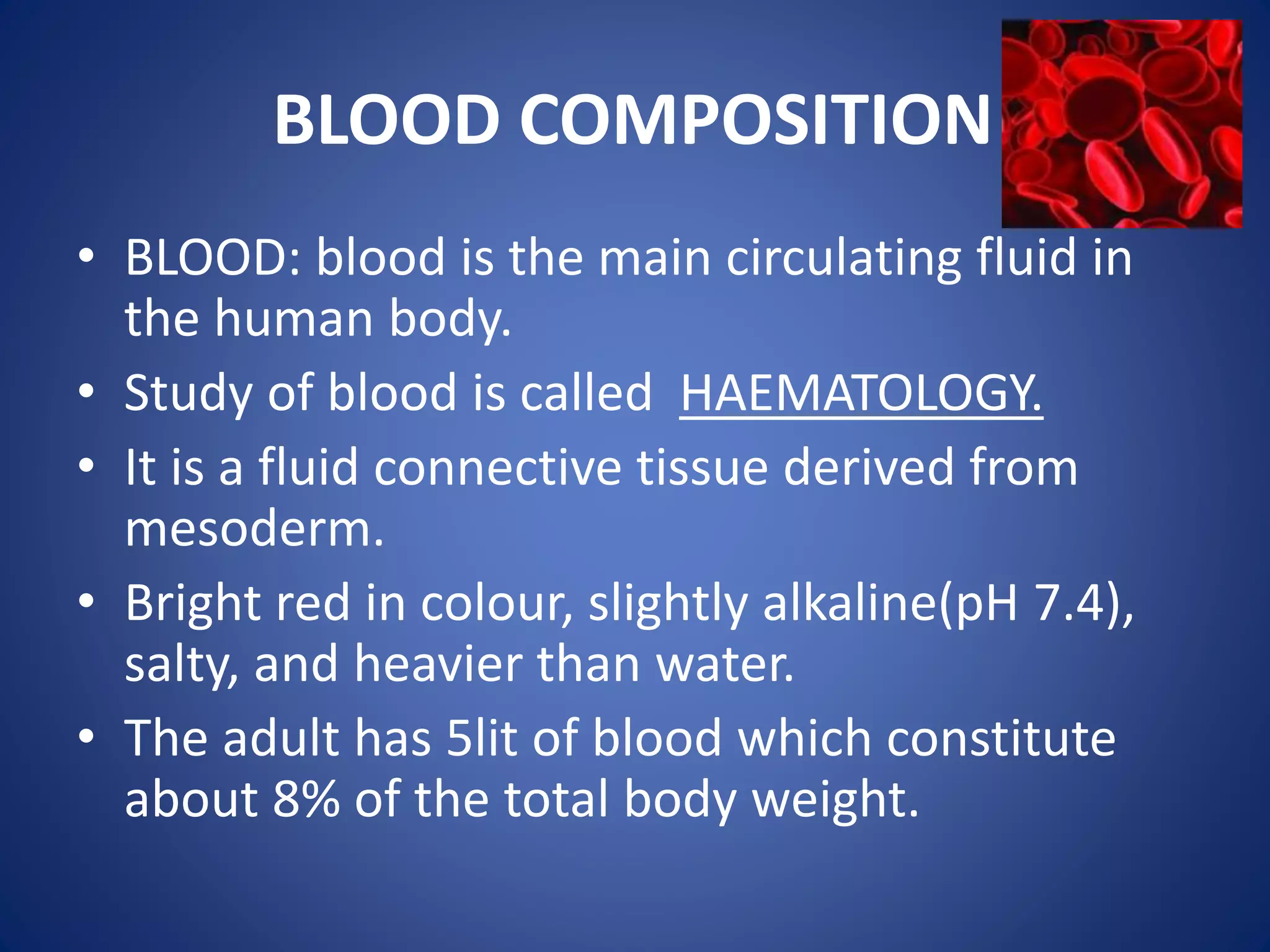 Blood is composed of plasma and cells. Plasma is 92% water and contains proteins, nutrients, waste products, gases and regulatory substances. Cells include red blood cells, white blood cells and platelets. Red blood cells carry oxygen and are biconcave and enucleated. White blood cells help fight infection - granulocytes contain granules and include neutrophils, eosinophils and basophils, while agranulocytes lack granules and comprise lymphocytes and monocytes. Platelets help form clots to stop bleeding. Together, blood regulates pH, transports substances around the body, protects against disease, and performs hemostasis.