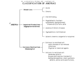 The document outlines various methods for blood corpuscle counting and the study of formed cellular elements in blood, detailing the composition of blood, types of blood disorders, specimen collection methods, and laboratory tests. It discusses the interpretation of results from tests like CBC, Hb estimation, and differential counts, as well as specific disorders associated with RBC, WBC, and platelet counts. Additionally, it emphasizes the importance of recognizing anemia and its underlying causes, as well as the methodological approaches to diagnosing blood-related conditions.