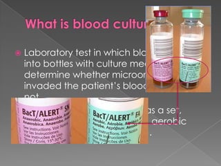 This document describes the process for collecting and analyzing blood cultures. Blood cultures involve injecting blood samples into bottles containing culture media to detect microorganisms. The process involves drawing blood via venipuncture, decontaminating bottle tops, applying antiseptic to the skin, inoculating bottles, mixing, labeling, and sending samples for analysis. Automated blood culture analyzers use techniques like fluorescence, colorimetry, or pressure changes to detect microorganism growth and provide results. Factors like adequate sample volume, contamination prevention, and analyzer features should be considered when purchasing a system.