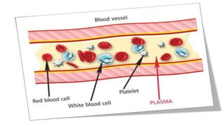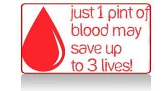 Blood is a vital liquid connective tissue that transports oxygen and waste, originating from the bone marrow and consisting of red blood cells, white blood cells, and platelets suspended in plasma. Blood donation is crucial for medical needs arising from accidents, cancer, and surgeries, and potential donors must be between 18-55 years old and meet certain health criteria. Regular donation is necessary as donated blood lasts about 40 days, and the body can safely replenish blood every three months.