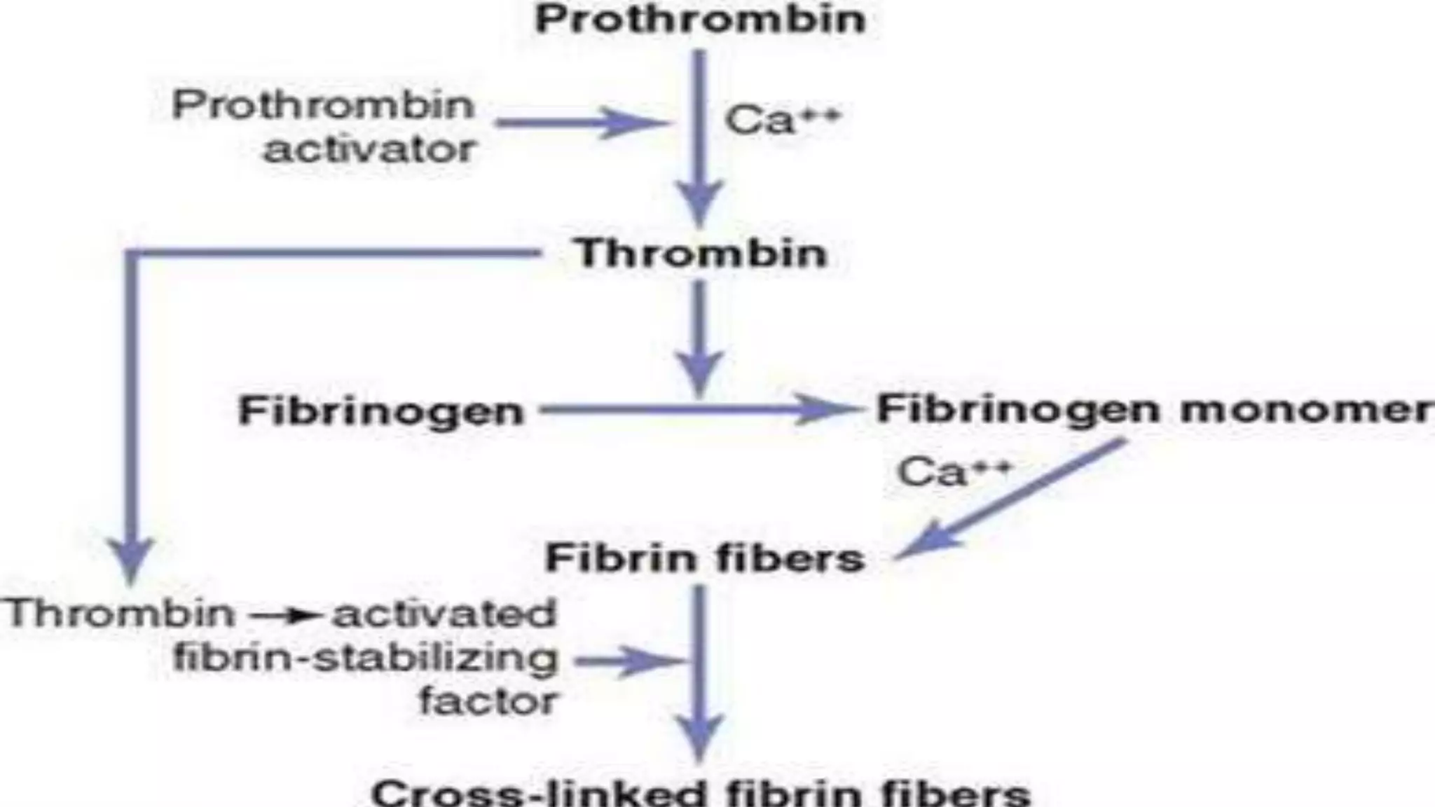 Blood clotting involves prothrombin activation, thrombin conversion, and fibrin formation trapping cells to form clots.