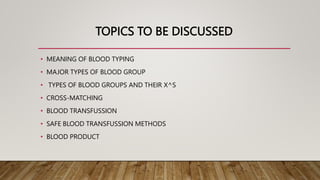 This document discusses blood typing, crossmatching, and blood transfusion. It begins by defining blood typing as a method to determine one's blood type based on the presence of antigens on red blood cells. There are four main blood groups - A, B, AB, and O - determined by the ABO system. The Rh system further distinguishes blood as Rh positive or Rh negative. Crossmatching involves testing a recipient's blood against donor blood to check for compatibility before transfusion. Proper blood typing and crossmatching are essential for safe blood transfusions.