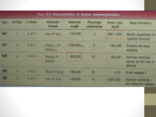 - Immunoglobulins are antibody proteins that are divided into five classes based on their heavy chain constant region: IgG, IgA, IgM, IgD, and IgE. They have a basic Y-shaped structure composed of two heavy and two light chains that allows for antigen binding