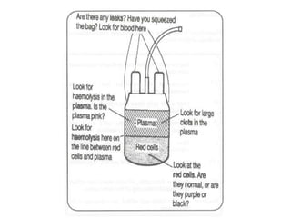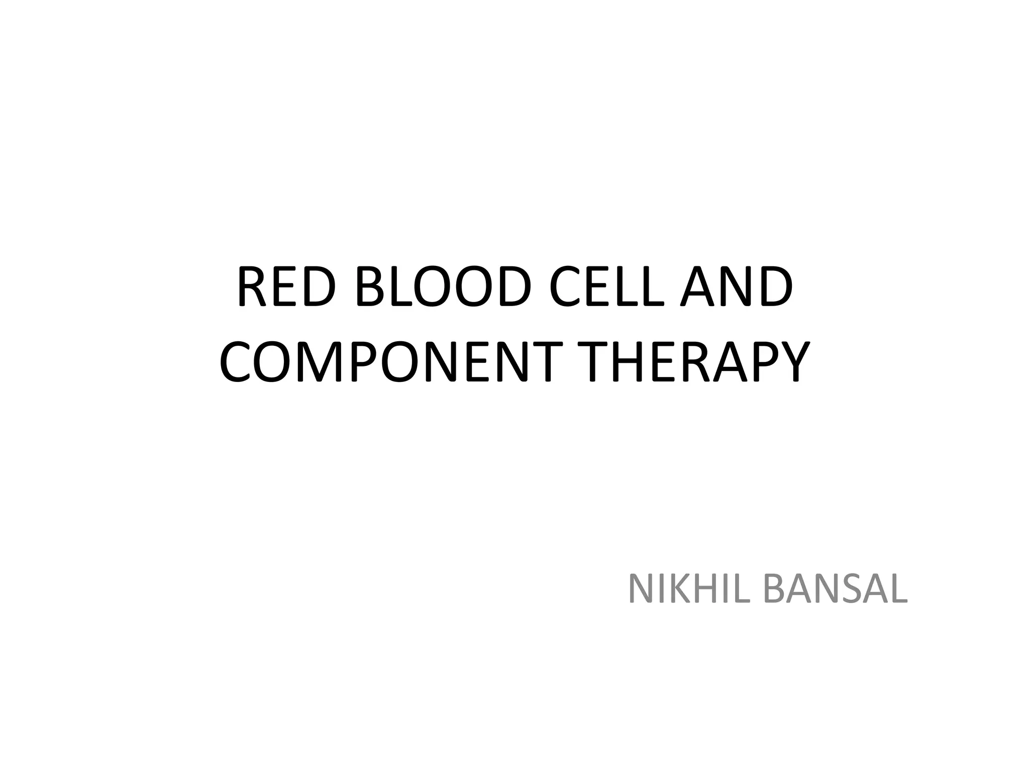 This document discusses red blood cell and component therapy. It covers three pillars of patient blood management: preoperative detection of anemia, intraoperative hemostasis and cell salvage, and postoperative optimization. It then describes the components that make up component therapy, including packed red blood cells (PRBC), platelets, fresh frozen plasma, cryoprecipitate, and leukoreduced and irradiated PRBCs. Indications for transfusion and potential complications are also summarized.