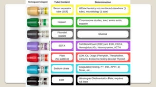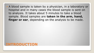 The document provides guidelines for blood sample collection procedures. It discusses introducing oneself to the patient, checking identification, selecting a vein, using the proper order and techniques for drawing blood into tubes, labeling the tubes, and applying pressure after withdrawing the needle. Precautions are outlined such as universal safety protocols, proper disposal of sharps, and cleaning up spills. The document also provides information on collecting samples from infants and the indications for rejecting specimens.