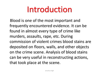 Blood spatter analysis is a crucial forensic tool used to reconstruct the events of violent crimes through the examination of blood stains. Different types of blood spatter, categorized by their velocities and formation methods, provide insights into the dynamics of the crime scene such as the direction of blood, weapon type, and victim positioning. The analysis helps differentiate between various bloodstain patterns like passive, transfer, and projected stains, along with calculating angles and areas of origin to determine the sequence of events.
