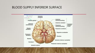 The document discusses the blood supply to the brain, including details about the inferior, lateral, and medial surfaces, as well as the Circle of Willis and major arteries involved such as the vertebral and internal carotid arteries. It provides a comprehensive overview aimed at assisting students in understanding brain blood supply. The author expresses gratitude to the open source community for their valuable contributions.
