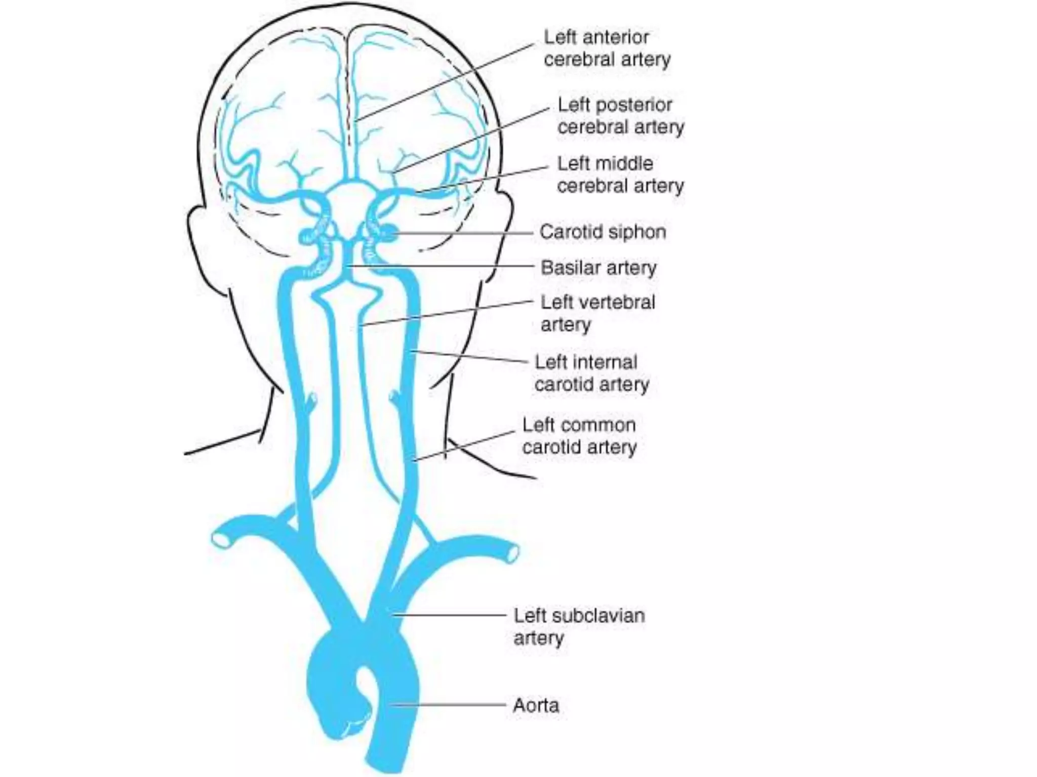 The brain receives a high blood supply to meet its metabolic demands. Arterial blood reaches the brain through the internal carotid and vertebral arteries, forming the circle of Willis at the base of the brain before branching into smaller vessels. Venous blood drains from the brain into internal jugular veins. Disruption of blood flow to the brain through cerebrovascular accidents like stroke can cause rapid loss of consciousness or permanent brain damage. Cerebrospinal fluid produced by choroid plexuses circulates within ventricles and around the brain and spinal cord, carrying nutrients and waste products.