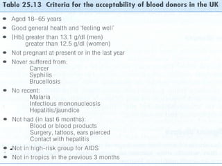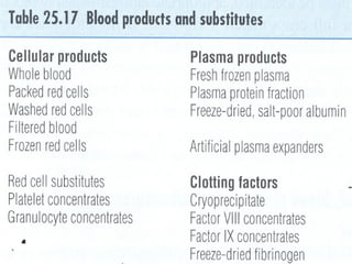 This document summarizes information about blood transfusions, including the different components that can be transfused and their indications. It discusses the major blood group systems, principles of blood typing and cross-matching to ensure compatibility. Safety considerations for donors and recipients are covered, as well as potential acute and chronic transfusion reactions. A variety of blood products are described, such as red blood cell concentrates, platelets, fresh frozen plasma and cryoprecipitate, along with their typical storage times.