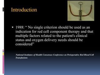 1) Guidelines from 1988 and 2010 that multiple factors should be considered for red blood cell transfusion based on a patient's clinical status and oxygen needs.