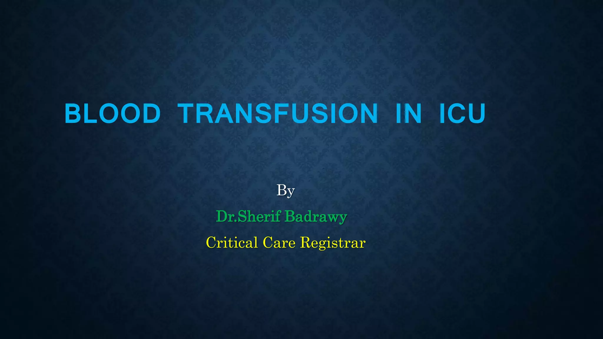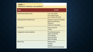 The document discusses blood transfusion in the ICU, including: