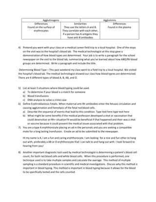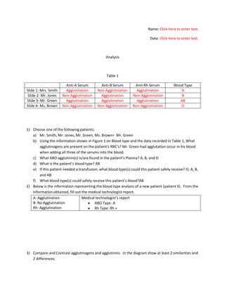 This document contains a blood typing analysis worksheet. It provides the results of agglutination tests using anti-A, anti-B, and anti-Rh sera on four patient samples. The worksheet shows that patient 3 (Mr. Green) had agglutination with all three sera, indicating their blood type is AB. The document then provides multiple choice and short answer questions to help understand blood typing and ABO incompatibility. It covers topics like agglutinogens and agglutinins, determining blood type in a lab, situations where blood typing is used, and minimizing disease risk in blood collection.
