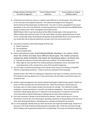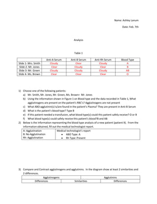 This document analyzes blood typing results for 4 patients: Mr. Jones, Mr. Green, Ms. Brown, and a new patient X. It summarizes that for Mr. Jones: his blood type is B, as anti-B serum was cloudy while the others were clear; he has B antigens on his red blood cells and B antibodies in his plasma; he can safely receive type O or B blood; and types B and AB can safely receive his blood. It also defines erythroblastosis fetalis as a condition where the mother and baby have incompatible blood types, causing the mother's antibodies to attack the baby's red blood cells in utero. Finally, it suggests that the next important breakthrough in blood research